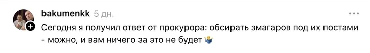 «Сегодня я получил ответ от прокурора: обсирать змагаров под их постами можно, и вам ничего за это не будет», — написал Давид.