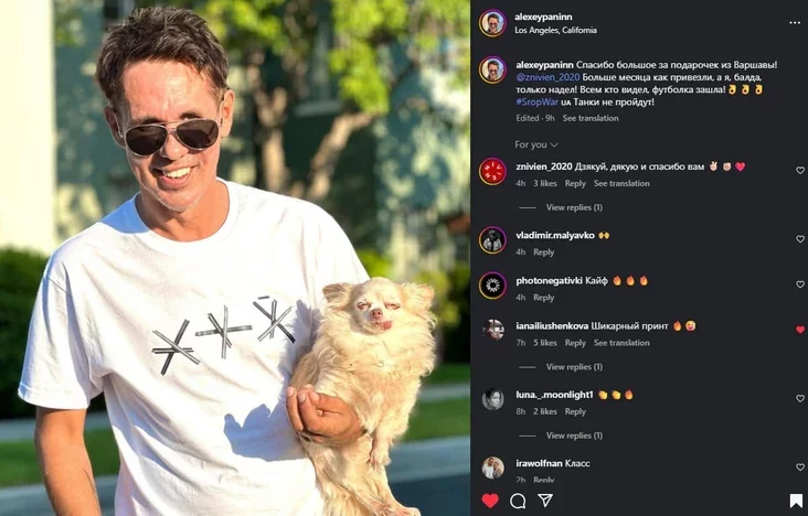 «Вторая идея была уже чисто предпринимательская, бизнесовая: если их много, можно ожидать определенную конверсию в продаже. Тем более что мы уже поработали с этим принтом с одним из представителей русской оппозиционной эмиграции — актером Алексеем Паниным. Он мгновенно откликнулся, выкладывал фото в нашей майке».