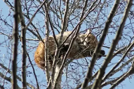 В Налибокской пуще засняли рысь, которая спала на самой верхушке дерева, а потом начала спускаться11