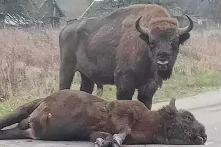В Польше военная машина насмерть сбила зубра. Удивило поведение его товарища7